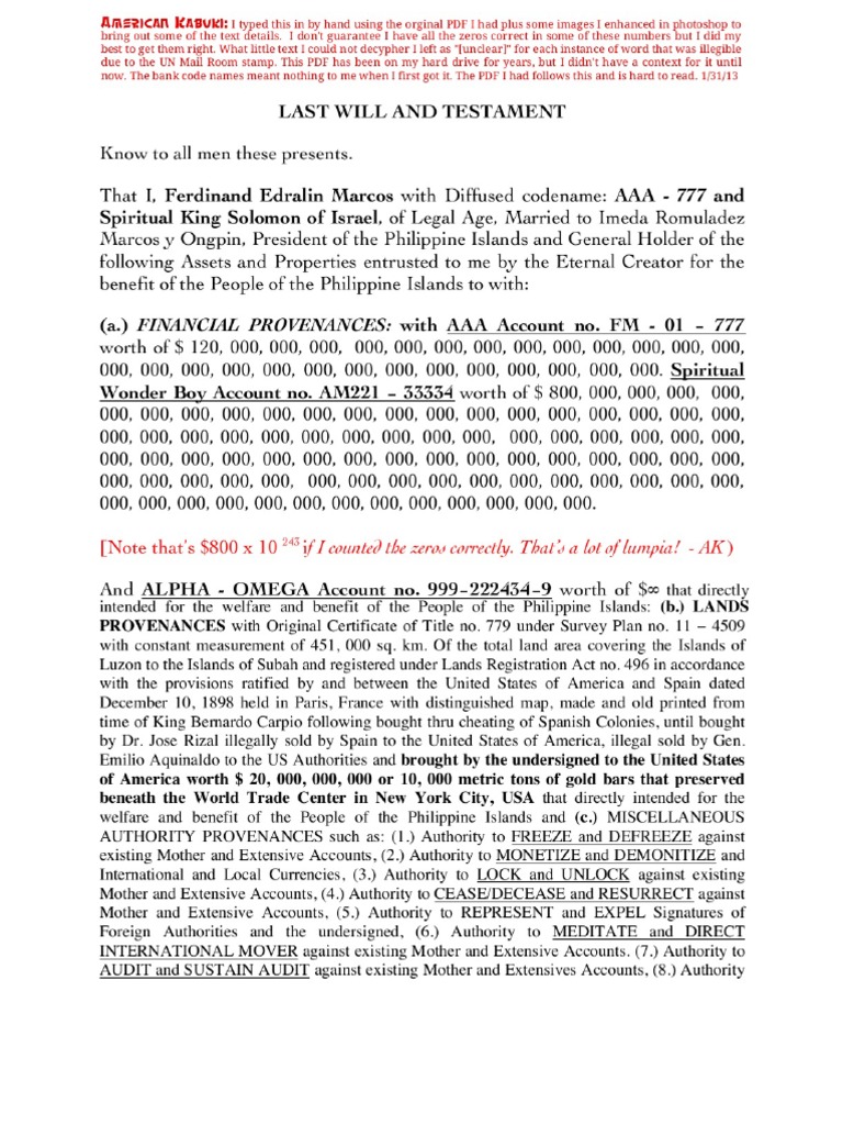 Last Will And Testament Of Ferdinand Marcos President Of The